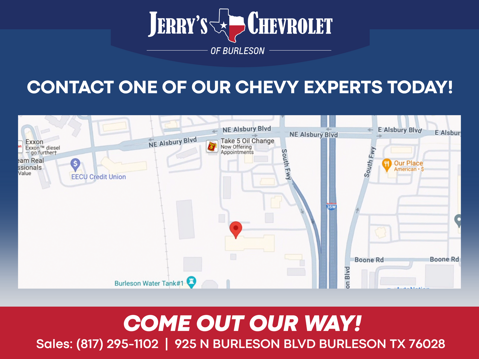 Jerry Durant is in Burleson! Family owned and operated for more than half a century, were here to take care of you through sales and outstanding customer service. Come out our way and trade your way! Call Today 817-295-1102.